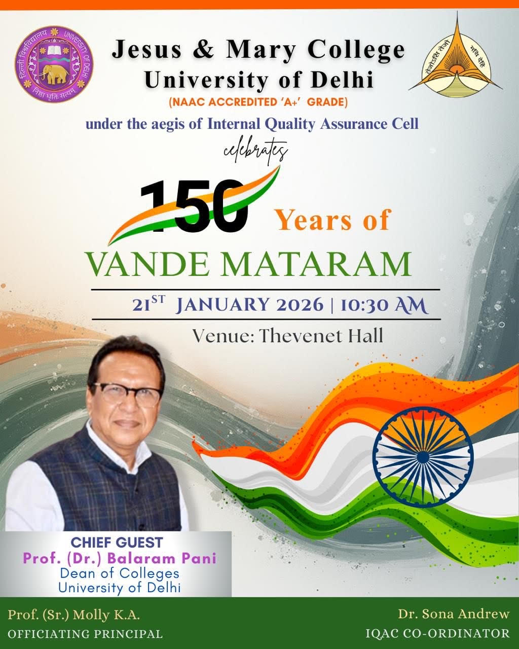 | 3 | 150 Years of Vande Mataram | Thevenet Hall | 21 Jan, 2026-21 Jan, 2026 | 10:30 AM | 20 Jan, 2026 03:32 PM | Poster |
