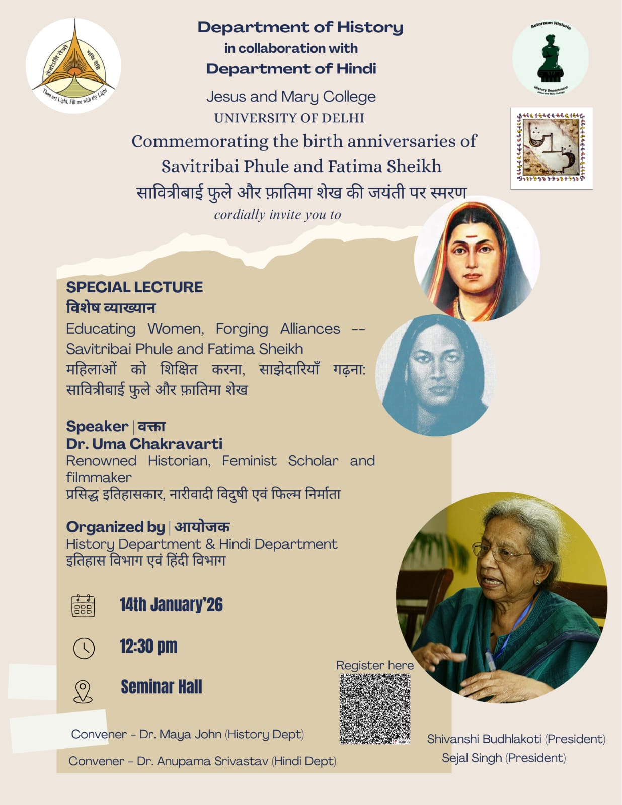 | 11 | special lecture by Dr Uma Chakravarti to commemorate the birth anniversaries of Savitribai Phule and Fatima Sheikh | Seminar Room (L-building) | 14 Jan, 2026-14 Jan, 2026 | 12.30 pm | 12 Jan, 2026 10:23 AM | Poster |